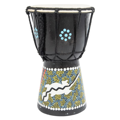 It’s Decorative and Functional, This Exotic Looking Replica of a Djembe Drum – The Goblet Shaped Drum has Leather Covering at Top with Braided Rope Trim and Handle and Painted Colorful Etchings of Lizard Designs Carved into the Base