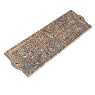 Since It’s Important to Conserve Water, This Plaque Offers a Suggestion to Prevent Both Drought and Thirst: “Save Water, Drink Beer” – It’s Made of Antique Brass Colored Cast Iron and Makes a Fun Addition to the Décor in the Bar Area