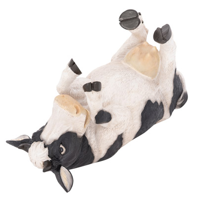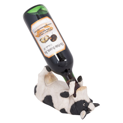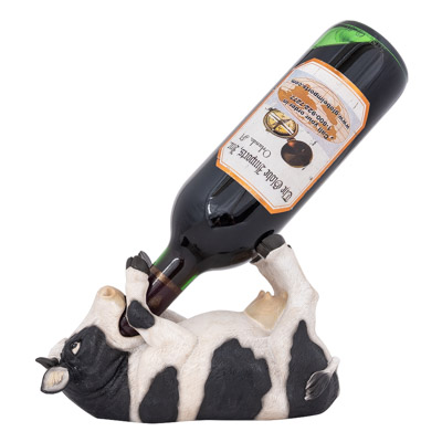 What Beverage Do You Associate With Cows?  Milk, You Say.  Well, Not This Heifer, This Thirsty Bovine Likes Wine – A Practical Decorative Accessory to Add to a Farm House Kitchen, Made of Cast Resin, She Will Happily Hold a Bottle Until…Shall We Say…the Cows Come Home – Bottle Not Included
