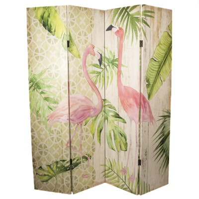 Here’s a Colorful Canvas-Covered, Double-Sided Screen with Four Folding Panels that Is Super Bright and Cheery – A Decoration Sure Enough But Also a Functional Room Divider With Images of a Pair of Pink Flamingos Standing in Lush Greenery – A Different Look on Each Side as Shown Here