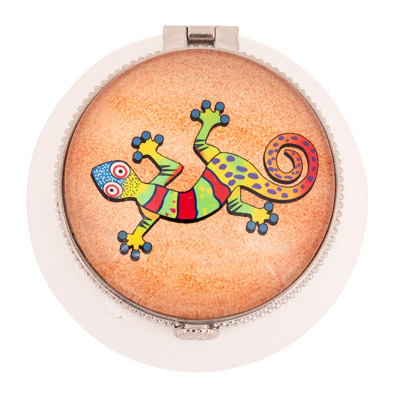A Cute White Ceramic Trinket Box With a Decorative Hinged Lid – There a Southwestern Style Colorful Gecko Lizard On the Lid on a Sand Colored Background – It’s a Useful Gift or Souvenir to Store Jewelry Inside