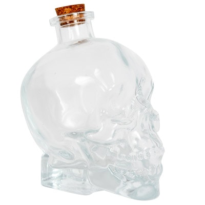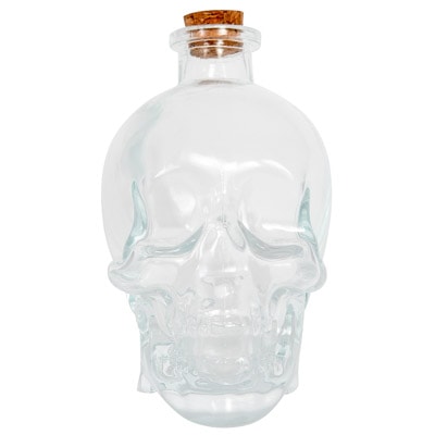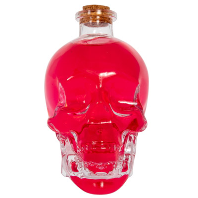 SALE – Heavy Clear Glass Bottle Shaped Like a Skull With a Cork Stopper in the Top – Lots of Creative Potential for This Quality Decorative Accent, Be It for Gothic, Halloween, or Skull Candy Uses – Also Shown Here Filled With Red Liquid to Show Detail