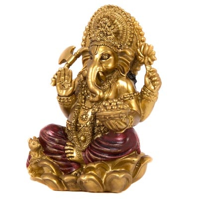 Antique Gold Colored Cast Resin Statute of Hindu Elephant God Ganesh Seated on Lotus Flower Base – Fine Detailing Accented with Deep Red as a Figurine and Great Symbol of India’s Religion, and Culture