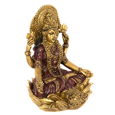 Rich Colored Antique Gold Hindu Goddess Lakshmi Seated on Lotus – Worshiped in India as the Goddess of Prosperity, Both Material and Spiritual, and the Embodiment of Beauty – Fine Detailing Accented with Deep Red