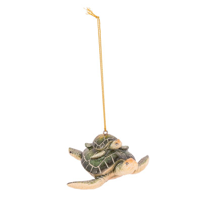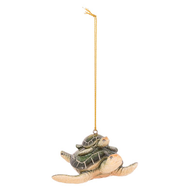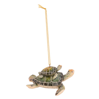 Oh Come, All Ye Faithful Sea Turtle Lovers, Behold This Ornament for the Christmas Tree – A Mama and a Baby Green Sea Turtle Made of Polystone Hangs from a Gold Thread for an Adorable Coastal Themed Christmas Item. Must be Ordered in Multiples of 6.
