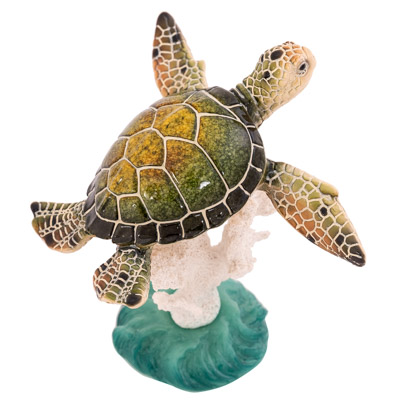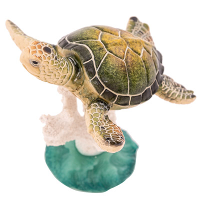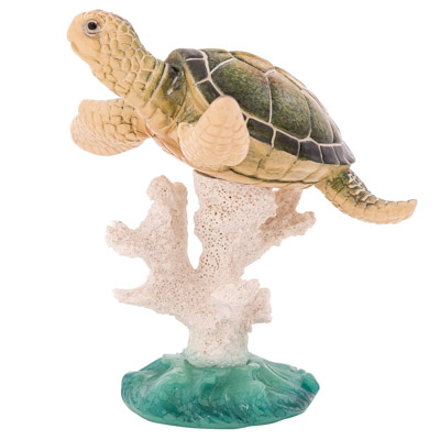 Smooth and Shiny Enamel-Finish Green Sea Turtle on a Textured Branch of Coral Reef Above a Translucent Water-Like Base – Made of Polystone – A Most Dramatic and Realistic Decorative Accessory for Marine Life Enthusiasts and Turtle Lovers