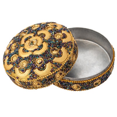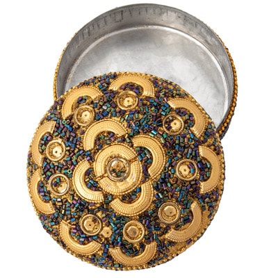 Round Trinket Box Made of Metal in Golden Color with Highlights of Deep Raven Purple and Decorated with Shimmery Seed Beads and Gold Sequins