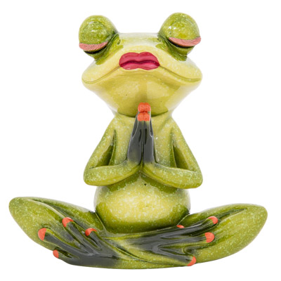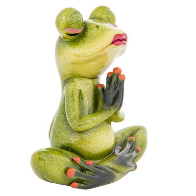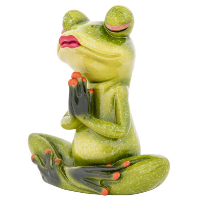 This Vivid, Shiny Green Lady Frog With Bright Red Lipstick, Eyes Closed is Practicing Yoga Seated in a Prayer Pose Position, Also Called the Salutation Seal or Anjali Mudra – Cute Collectible for a Fan of Frogs, Yoga, or Mediation – Made of Polystone