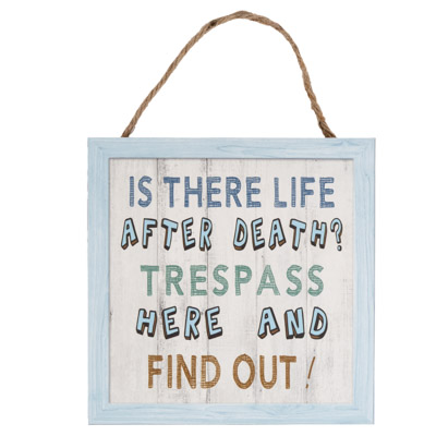 Here’s a No Trespassing Sign With a Sense of Humor – This Square Wooden Warning Hangs from a Rope and Both Asks and Answers the Eternal Question: “Is There Life After Death? Trespass Here and Find Out!”