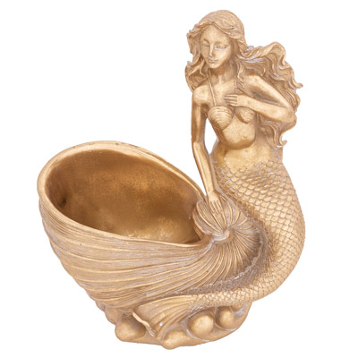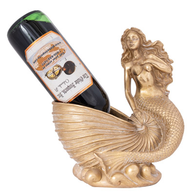 This Lovely Mermaid Figurine is Sitting on a Nautilus Shell and the Shell Will Hold a Wine Bottle – It is Made of Polystone and Finished in a Dramatic Gold Color – It Makes a Wonderful Coastal Decorative Accessory As Is and It Does Double-Duty as Purposeful Item as Well