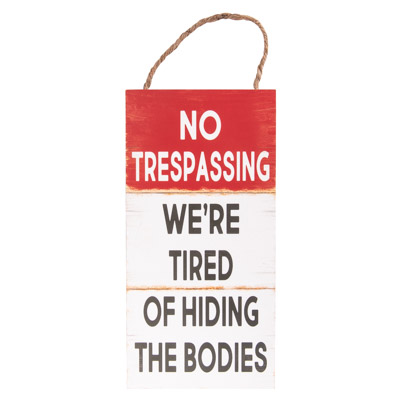Hang This Rectangular Wooden “No Trespassing” Post from the Rope on the Back as a Deterrent, Especially With the Explanation Given – The Sign Goes On to State “We’re Tired of Hiding the Bodies” – Consider Yourself Forewarned