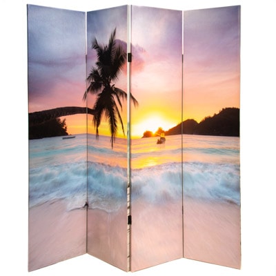 One Side of This Canvas-Covered Four-Panel Room Divider Beckons You to Pull Your Boat On Up to the Dock and the Other Side Invites You to Dip Your Toes in the Water – There are Pelicans, Pilings, and Palm Trees, with Sand, Shore and Sunsets on This Welcoming Functional Furniture Accent