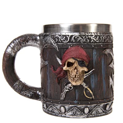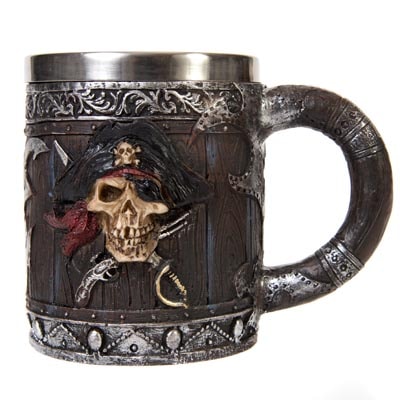 Buccaneer’s Tankard in Wood and Pewter Look with Pirate Skull Designs on Both Sides Complete with Muskets and Swords – Actually a Usable Mug Made of Cast Resin with Metal Lining