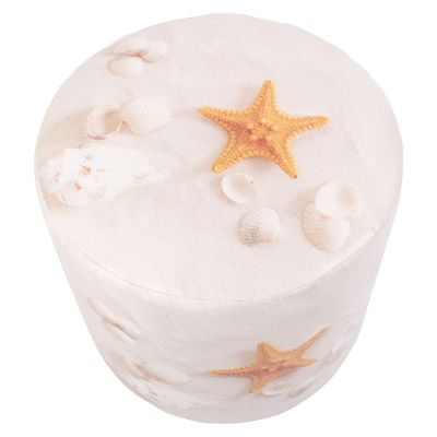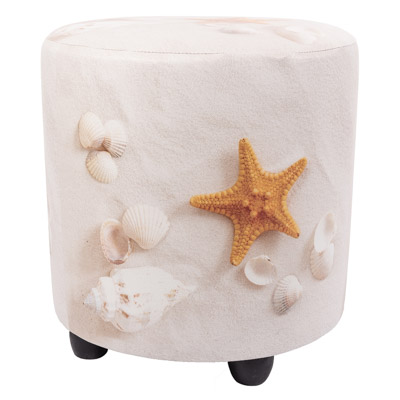 A Beautiful Coastal Foot Stool or Ottoman – It’s Round, Covered with Leatherette with a Seashore Themed Design in Neutral Colors Featuring, Sand, Shells and Starfish – A Versatile Furniture Accessory to Move Around the Room, Use as an Extra Seat, Put Your Feet Up or Just Decorate With It Because It Looks Splendid Whenever It Is