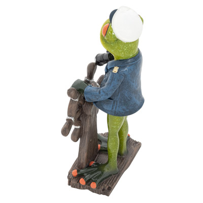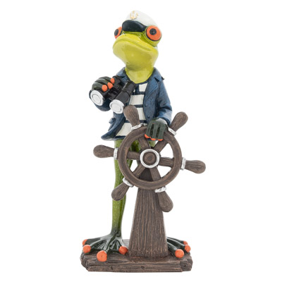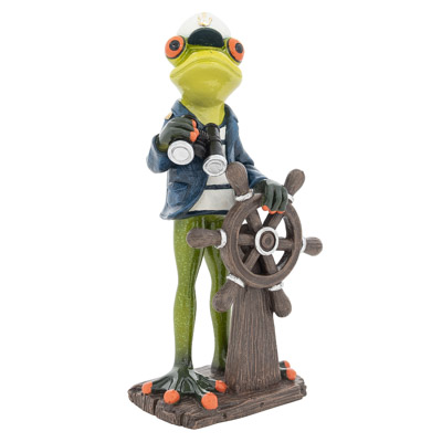 Here’s a Distinguished Sea Captain Frog Figurine Standing Seriously at the Helm, Ship’s Wheel in Hand, Fearlessly Ready to Cross the Pond – Made of Polystone, He’s an Irresistible and Not So Serious Gift Item for Any Seafaring Person or Tadpole on Your List