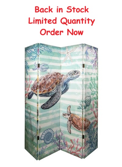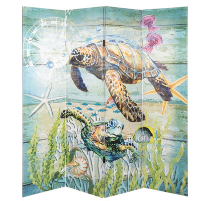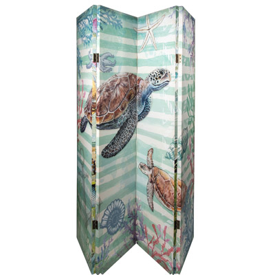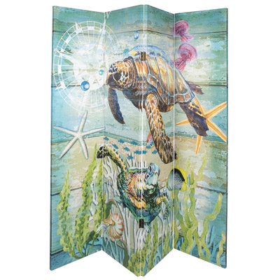 Two Different Artistic Sea Turtles Underwater Scenes on One Screen – Each Side is Different – It Could Easily Be a Large Piece of Art for the Room, But It is a Practical Four-Panel Folding Canvas Covered Room Divider for a Beachside Retreat or a Coastal Cottage