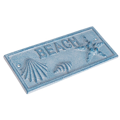 This Lovely Blue-Verdigris Finish Plaque for the Wall is Decorated with Seashells and a Starfish and the Word Beach – Mount it at a Home by the Seashore to Show Where You Are or by the Pool to Show Where You Want to Be – Designed As If It Were Written in Sand Rather Than the Cast Iron It Really Is