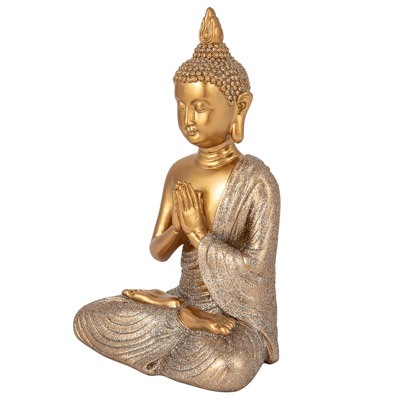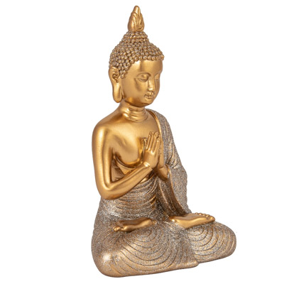 Peaceful Looking Thai Buddha Figurine Made of Cast Resin and Finished in Gold and Shimmery Silver – A Symbol of Enlightenment Seated in a Praying Pose, It’s a Decorative, Calming Accessory for the Home or a Lovely Gift