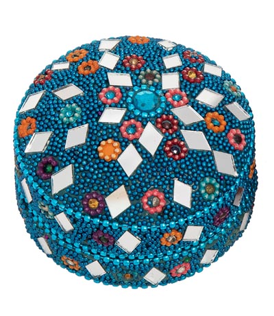 Set of Three Sparkly Decorative Aqua Blue Trinket Boxes – Made of Metal and Covered with Mirror Tiles, Colorful Beads, and Sequins
