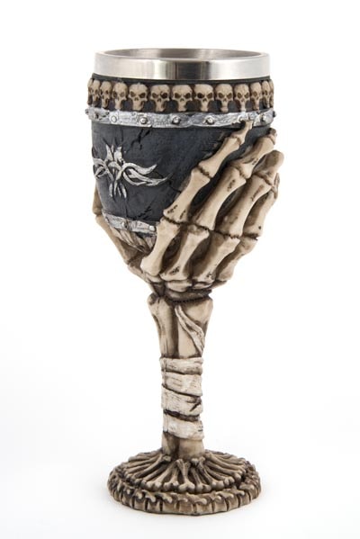 Eerie Wine Chalice with Bones and Skulls – Skeleton Hand and Arm Bone Forms Stem of Goblet – Made of Cast Resin with Metal Lining Makes it Usable if One Dares