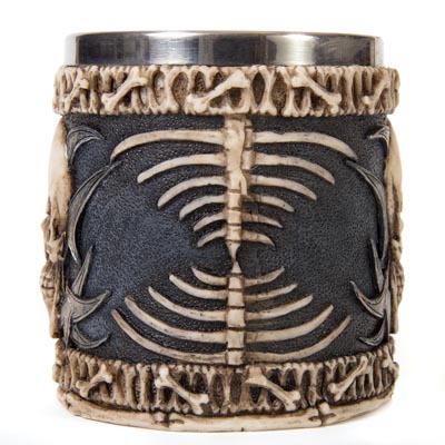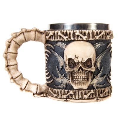 A Mug that’s Bad to the Bone for Anybody from Bikers to Pirates – Wicked Looking Skull, Border of Bones and a Handle Made to Look Like Back Vertebrae – It’s Useable for Drinking, Made of Cast Resin with Metal Lining with Design on All Sides