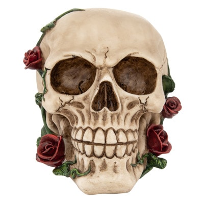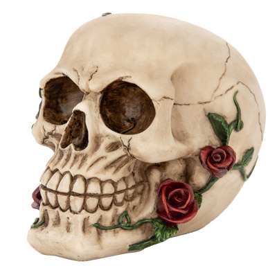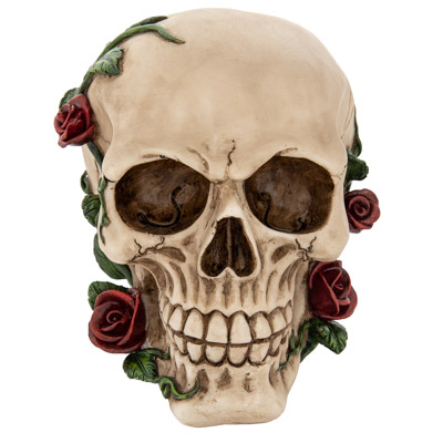 It’s a Decoration for the Home or a Unique Gift That Was Inspired by Tattoo Art and Perhaps Rose Thorns – This Realistic Looking Skull is Made of Cast Resin and is Draped With a Vine of Red Roses Growing On the Bony Head