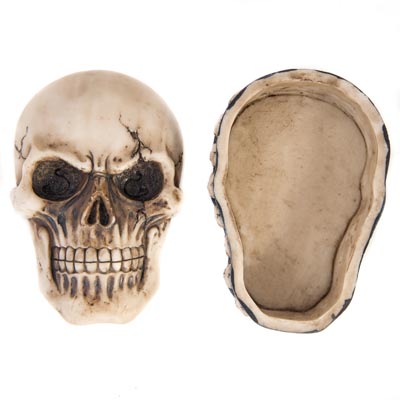 Remove the Front of the Skull and You’ve Opened the Top of the Box – Since His Head is Empty Inside, You Have a Place to Put Stuff – Creepy Cast Resin Skull Box Makes a Unusual Gift or Decoration