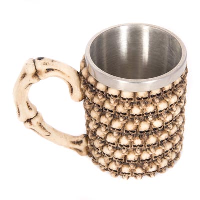 Spooky Tankard Covered on Entire Outside with Design of 3-D Stacked Skulls and Handle Detailed to Look Like Bones – Actually a Usable Mug Made of Cast Resin with Metal Lining