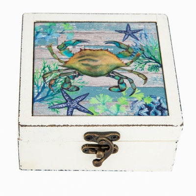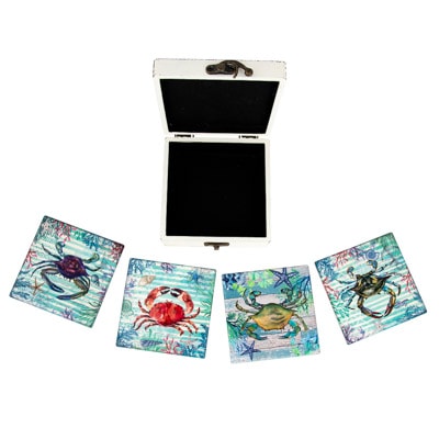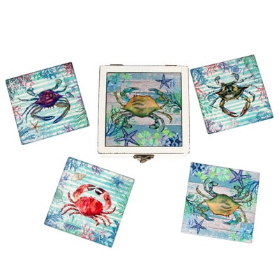 Set of Four Colorful Crab Coasters Made of Ceramic – Each One in the Set is Square and Has a Different Image on Turquoise Background – The Set Comes With a Convenient Coordinating Hinged Wood Box With Ceramic Tile Lid to Store the Coasters When Not In Use