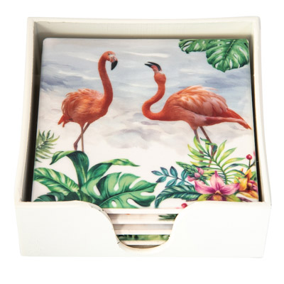 Colorful Set of Useful Square Flamingo Coasters Made of Ceramic – Each Coaster Features a Different Image Showing a Pair of Pink Flamingos In Green Tropical Palms and Plants – Set of Four Coasters Comes With a Convenient Holder to Store the Coasters Until Needed