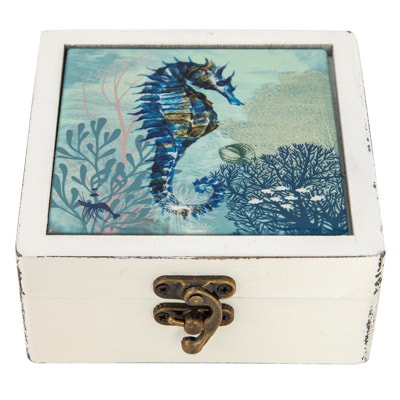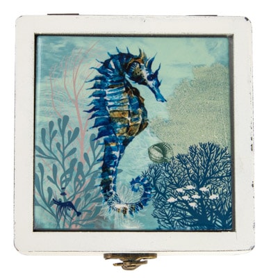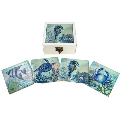 Set of Four Marinelife Themed Coasters Made of Ceramic – Each One in the Set is Square and Has a Different Design, There’s a Turtle, a Crab, a Seahorse, and a Fish – Set Comes With a Convenient Coordinating Hinged Box to Store the Coasters When Not In Use