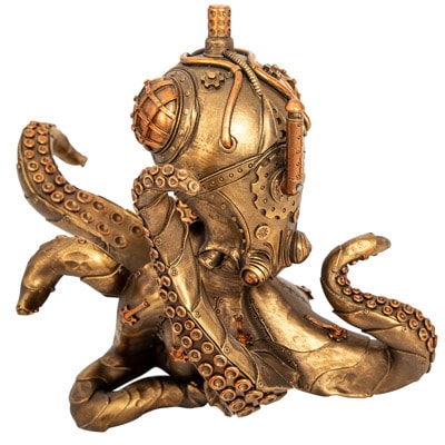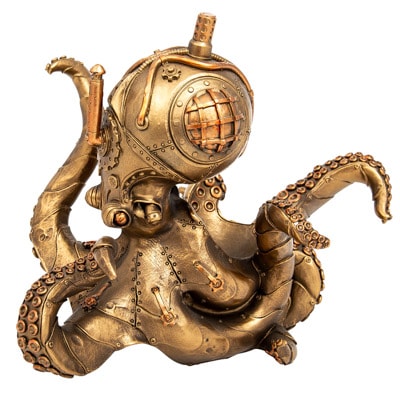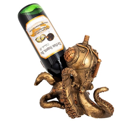 What has Eight Arms, is Antique Brass in Color, Can Hold a Wine Bottle and Looks Like a Creation from the Imagination of Jules Verne? – The Answer is This Unique Polystone Steampunk Octopus Figurine Wearing a Diving Helmet