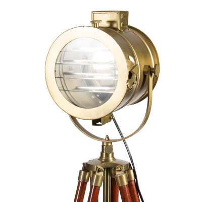 Unusual Floor Studio Style Lamp – Wooden Base Modeled After the Tripod Base of a Telescope with Mounted Antique Finish Metal and Glass Light on Top Similar to Light Used in a Movie Studio