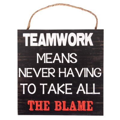 SALE – Looking for a Motivation Sign for Work, Well, This Isn’t It – This Flippant and Sarcastic Square Wooden Sign With Rope Hanger Says “Teamwork Means Never Having to Take All the Blame”