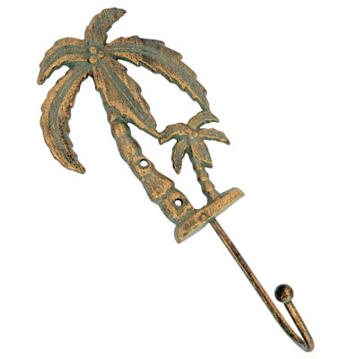 Substantial Size Hook for Clothes or Keys Underneath a Large and Small Palm Tree Makes a Decorative and Functional Accent for an Island Tropical Decor – Made of Iron and Finished in a Golden Verdigris Patina