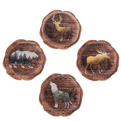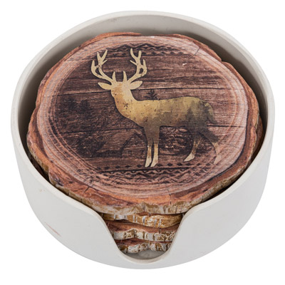 This Practical and Attractive Set of Four Round Ceramic Coasters Comes in a Holder and Features Different Woodland Animals – There’s a Deer, a Bear, a Moose, and a Wolf and Each Coaster is Shaped Like a Slice of a Redwood Tree – Great Gift for the Indoors for a Lover of the Great Outdoors